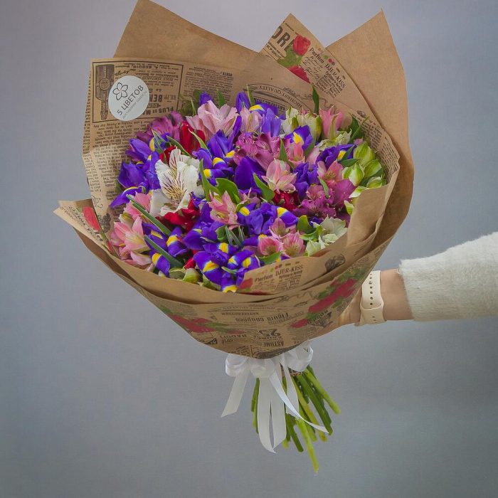 Букет из 20 ирисов и 15 альстромерий