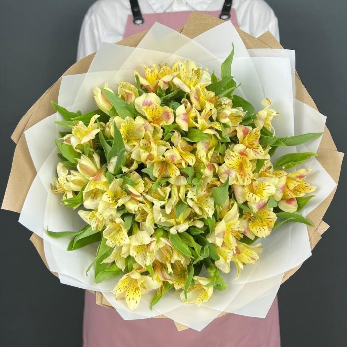 Альстромерия – 15 шт.Лента атласная – 1 шт.бумага крафт – 3 шт.бумага дизайнерская – 3 шт.