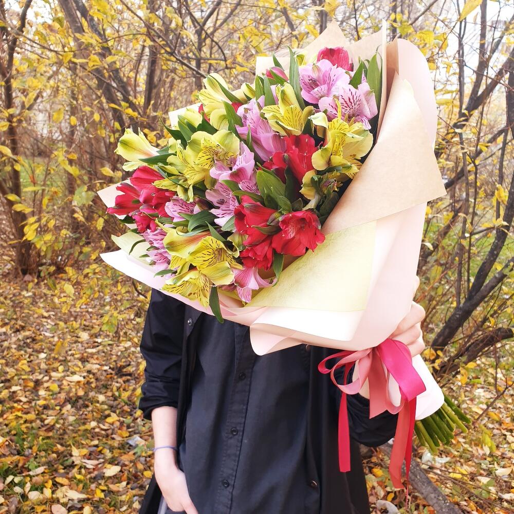 Лента атласная – 2 шт.Упаковка дизайнерская – 3 шт.Открыточка с вашими пожеланиями – 1 шт.Альстромерия Микс Европа – 15 шт.любовь флориста (бесплатно) – 1 шт.