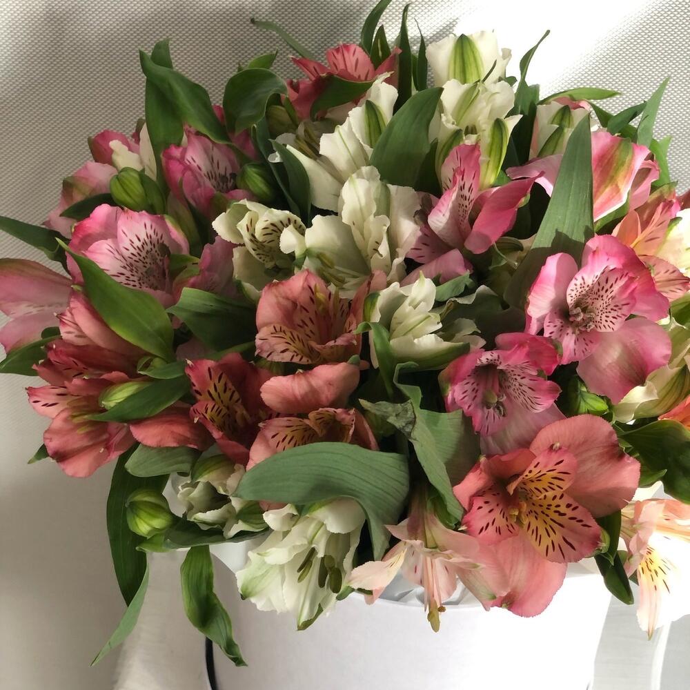 Альстромерия – 11 шт.Упаковка дизайнерская – 2 шт.Коробка шляпная – 1 шт.Пиафлор (оазис) – 1 шт.