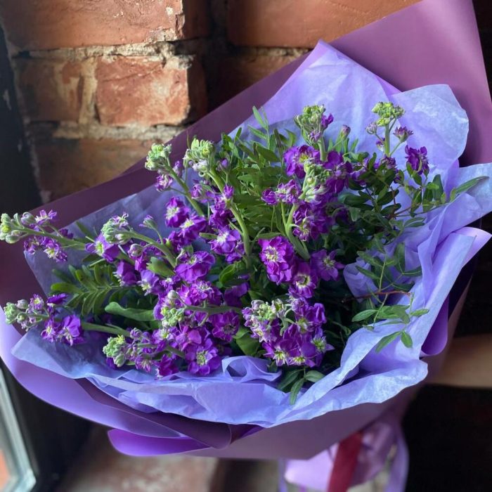 Букет из 11 фиолетовых маттиол и фисташки в стильной упаковке “Вайолет”