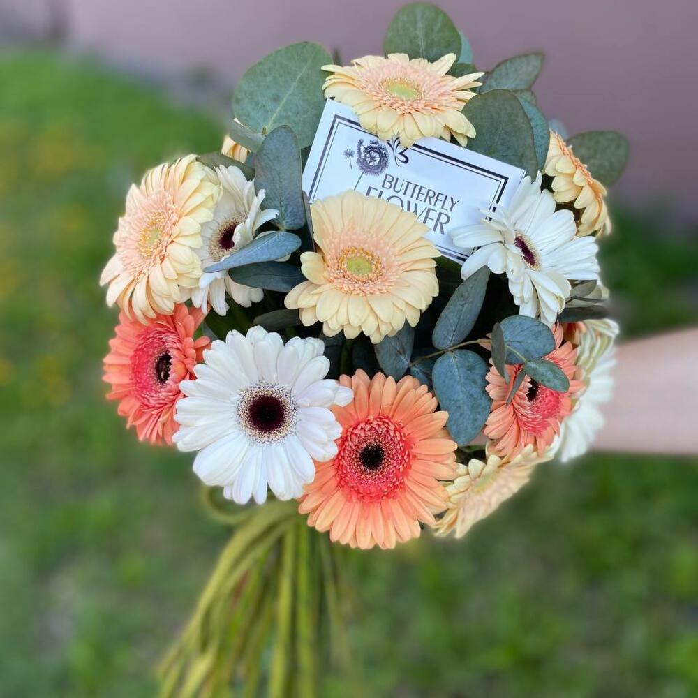 Букет из 25 разноцветных мини-гербер и эвкалипта “Персиковый калейдоскоп”
