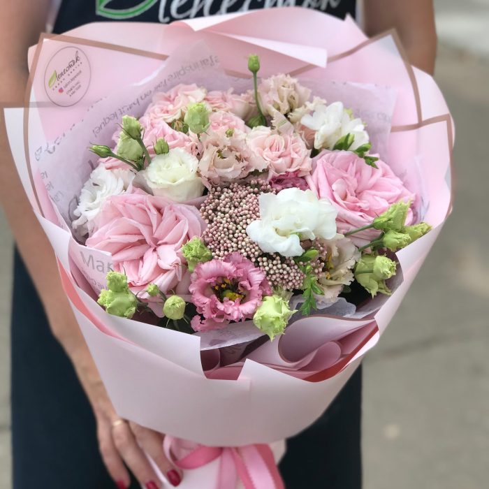 Альстромерии, Гвоздики, Кустовые розы, Лизиантусы, Розы, Хризантемы