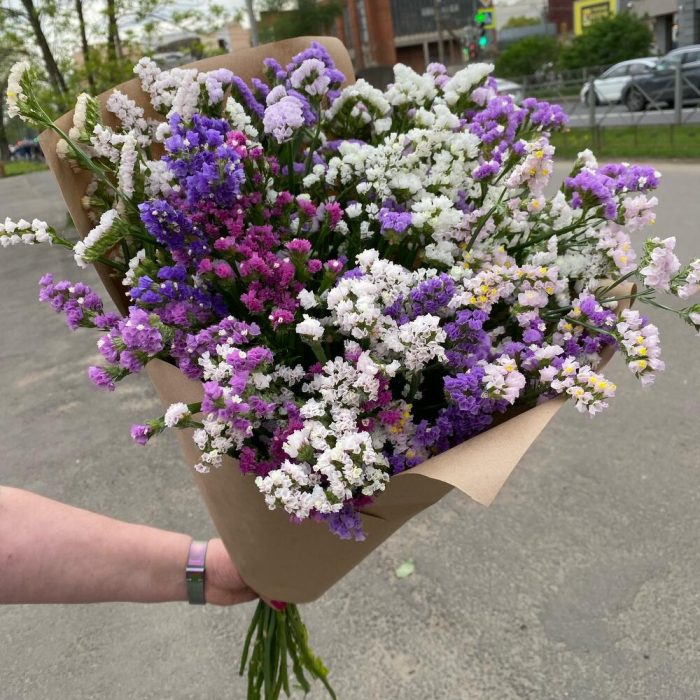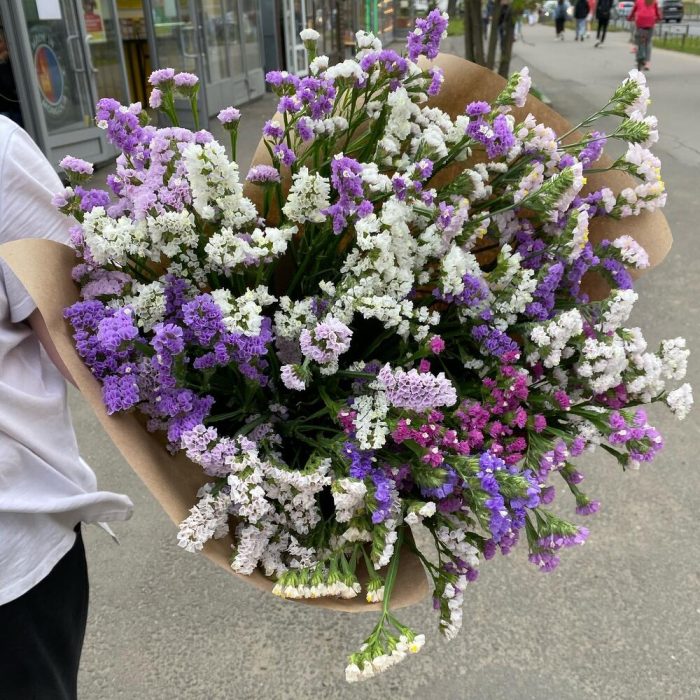 «Лавандовое созвездие» Букет из розы, гвоздики, статица и хлопка