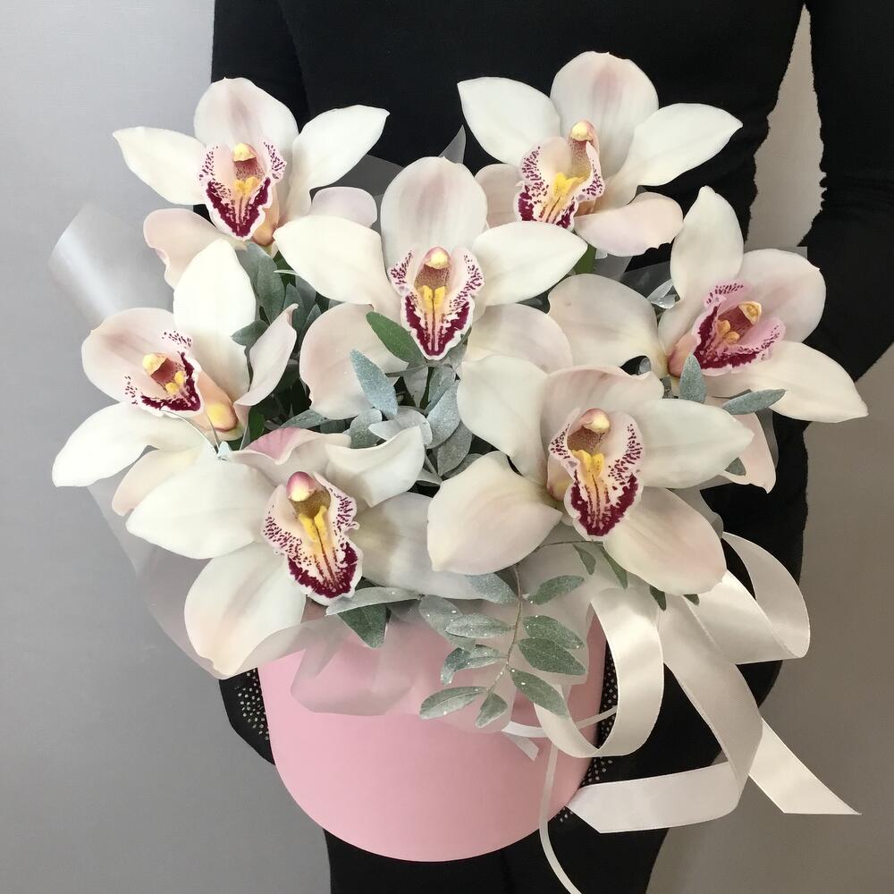Лента атласная – 1 шт.Оазис флористический – 1 шт.Цимбидиум белый – 7 шт.фисташка крашенная – 3 шт.коробка шляпная 16х16 – 1 шт.