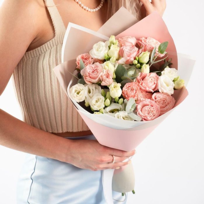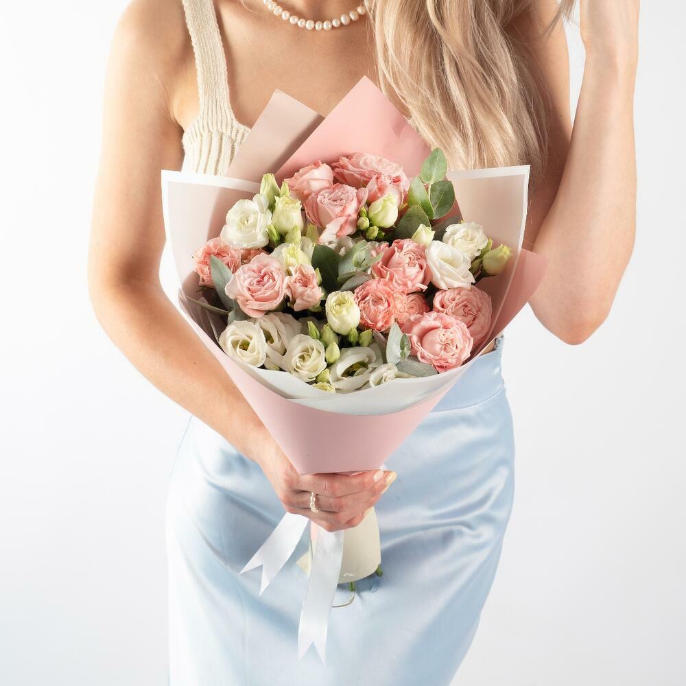 spray peony roses – 3 шт. Eustoma – 2 шт. packaging – 2 шт. gift massage card – 1 шт. care instruction – 1 шт.