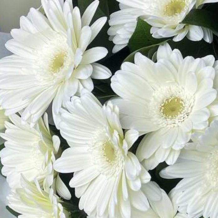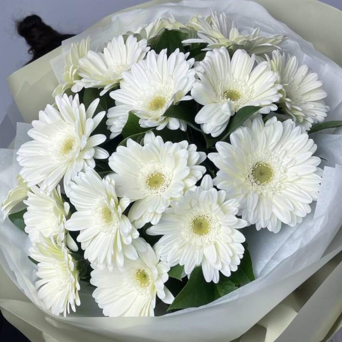 Гербера белая – 17 шт.Салал пучок – 1 шт.Пленка матовая – 8 шт.Тишью белое – 2 шт.