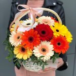 герберы – 17 шт. Писташ – 6 шт. Корзина – 1 шт. Оазис – 2 шт. Оформление – 1 шт.
