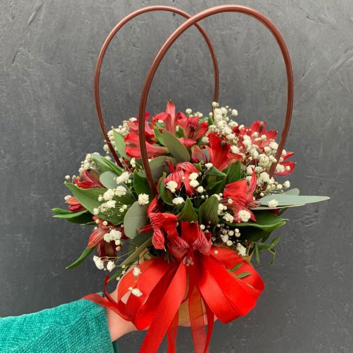 Альстромерия – 5 шт.Гипсофила – 2 шт.Фисташка – 5 шт.Эвкалипт – 5 шт.Сумочка картонная – 1 шт.Оазис флористический – 1 шт.Лента атласная – 3 шт.