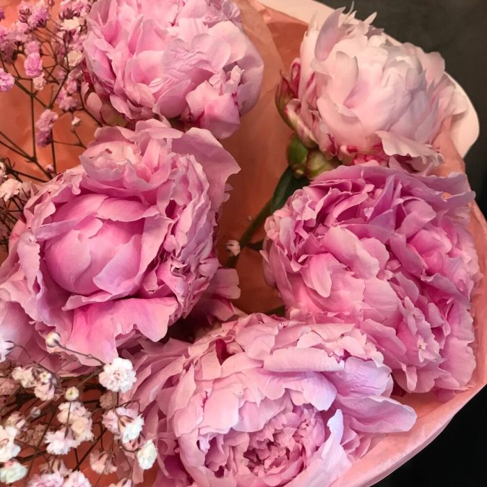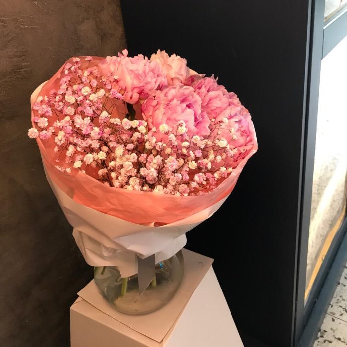 Гипсофила – 2 шт.Лента – 1 шт.Тишью – 2 шт.Пион Сара Бернар – 5 шт.Пленка матовая – 1 шт.Средство для продления жизни цветов – 1 шт.