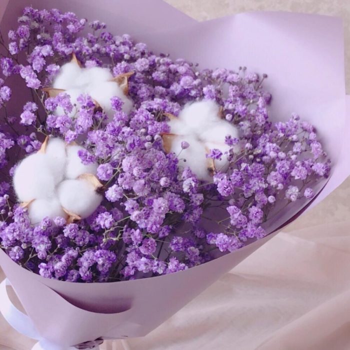 Хлопок – 3 шт.Лента атласная – 1 шт.Упаковка дизайнерская – 1 шт.Гипсофила фиолетовая – 3 шт.