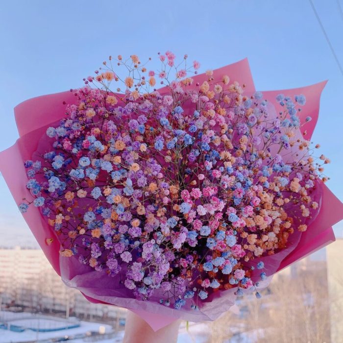 Лента атласная – 1 шт.Упаковка дизайнерская – 1 шт.инструкция по уходу за цветами – 1 шт.радужная гипсофила – 3 шт.витамины для цветов – 1 шт.
