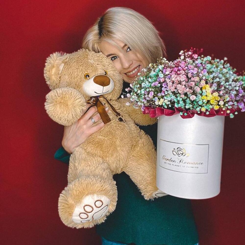 Коробка шляпная – 1 шт.Флористическая губка (оазис) – 1 шт.гипсофила радужная – 11 шт.мягкая игрушка медведь (50 см) – 1 шт.