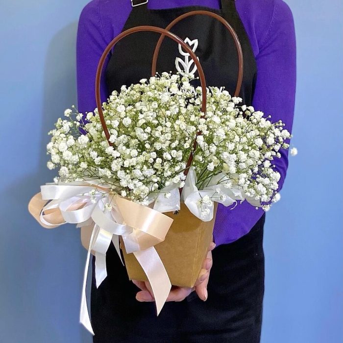 Гипсофила – 3 шт.Лента атласная – 2 шт.Сумочка – 1 шт.