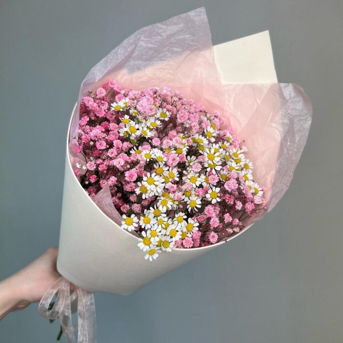 Нежный кулечек из розовой гипсофилы и ромашки