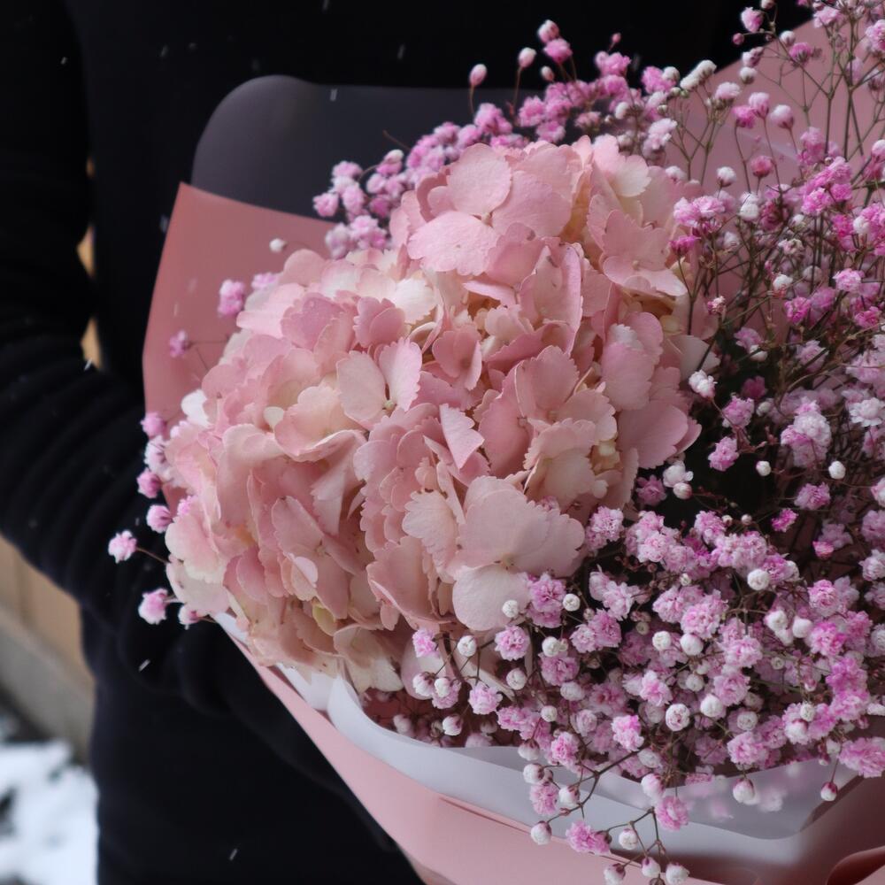 Букет из гортензии, роз, эустомы, вереска, диантусов, кустовых пионовидных роз и седума в стильной упаковке