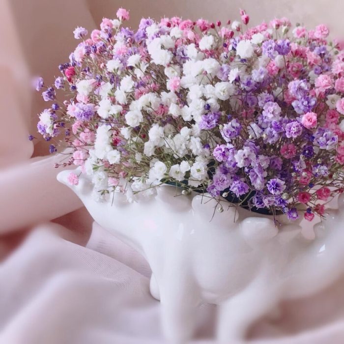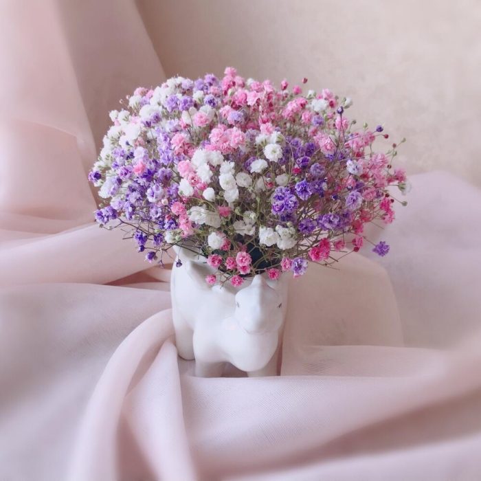 Кашпо керамическое – 1 шт.Флористическая губка (оазис) – 1 шт.радужная гипсофила – 3 шт.