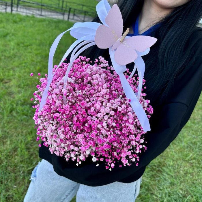 Гипсофила – 7 шт.Лента атласная – 1 шт.Сумочка – 1 шт.Открыточка с вашими пожеланиями – 1 шт.