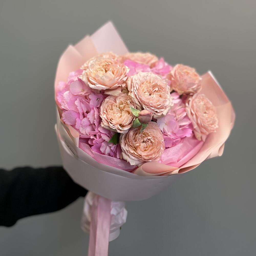 Букет из гортензии и кустовой пионовидной розы Juliet