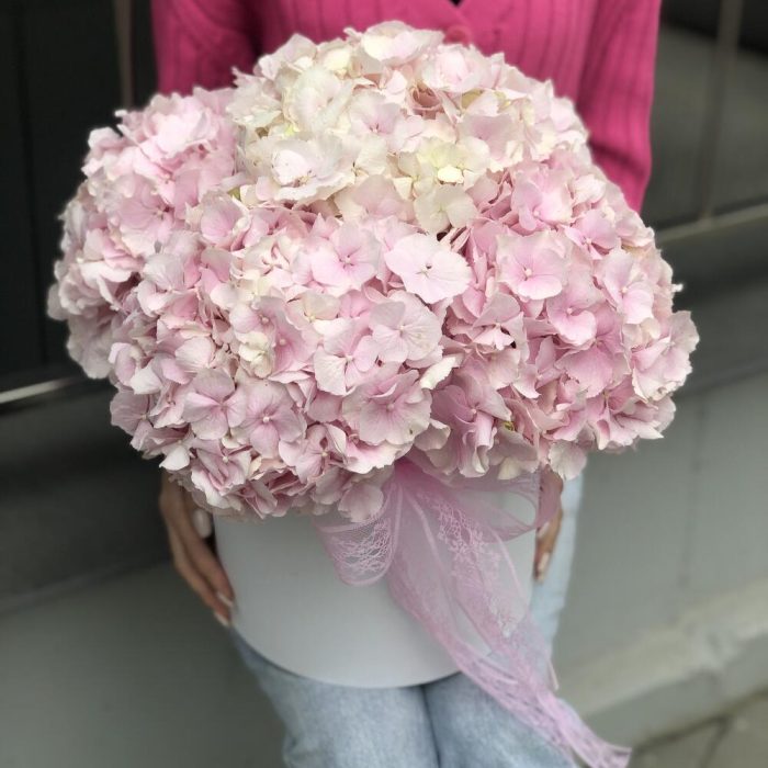 Оазис – 4 шт. Коробка – 1 шт. Оформление – 1 шт. Гортензия розовая – 5 шт.