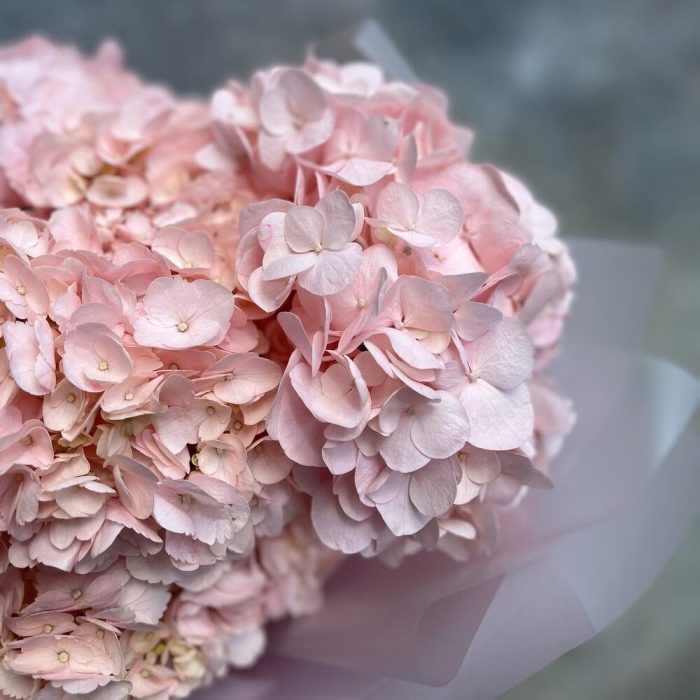 Букет из гортензии, гербер, диантуса, лимониума, кустовой хризантемы и зелени в стильной упаковке