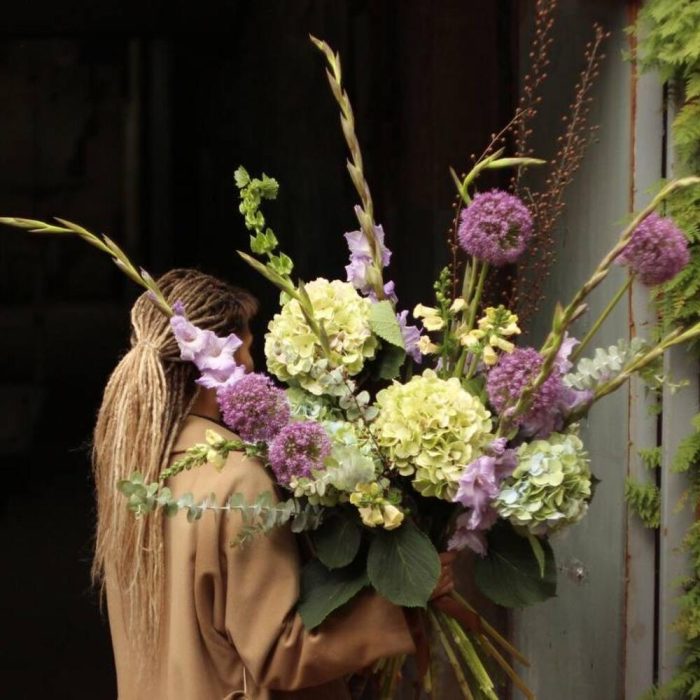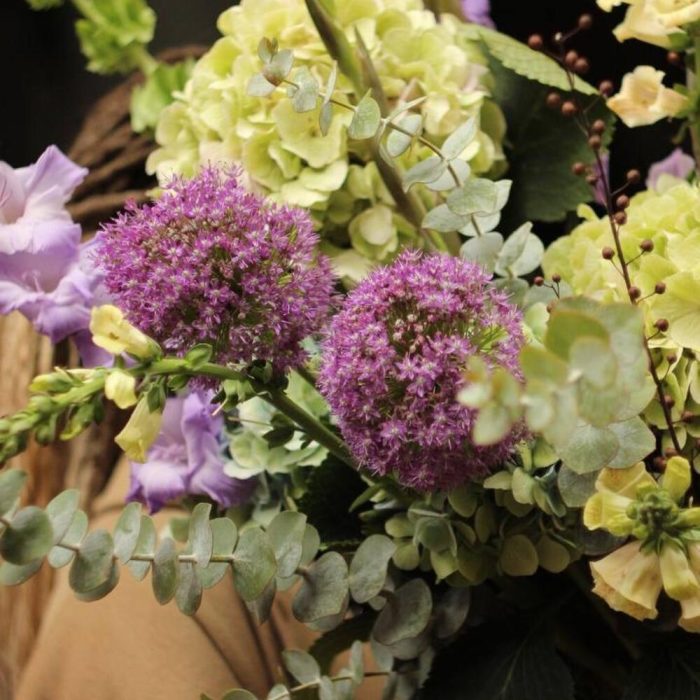 Гортензия – 5 шт.Аллиум – 5 шт.Гладиолус – 7 шт.Наперстянка – 5 шт.Лен – 3 шт.Эвкалипт – 9 шт.Лента – 1 шт.