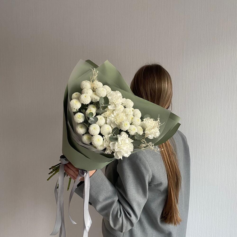 Хризантема – 5 шт.Диантус – 6 шт.Сухоцветы – 1 шт.