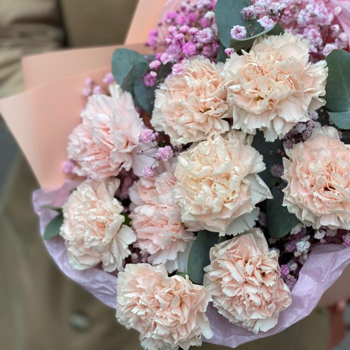 Диантус – 9 шт.Гипсофила – 2 шт.Эвкалипт – 2 шт.Упаковка дизайнерская – 1 шт.