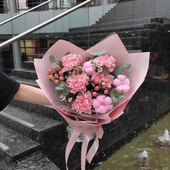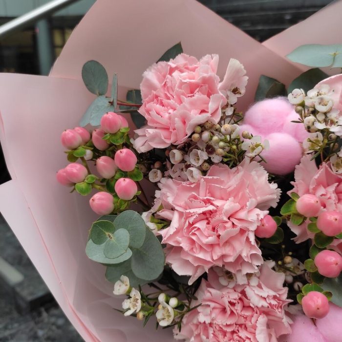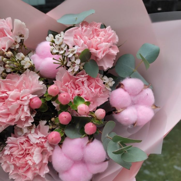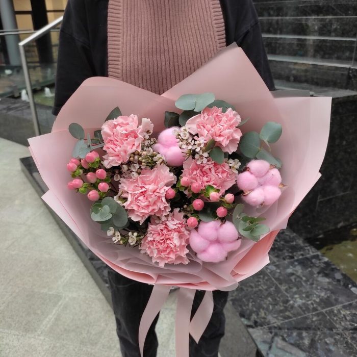 Гвоздика – 5 шт.Хлопок – 3 шт.Гиперикум – 2 шт.Ваксфлауэр – 1 шт.Эвкалипт – 1 шт.Упаковка дизайнерская – 2 шт.Лента – 2 шт.