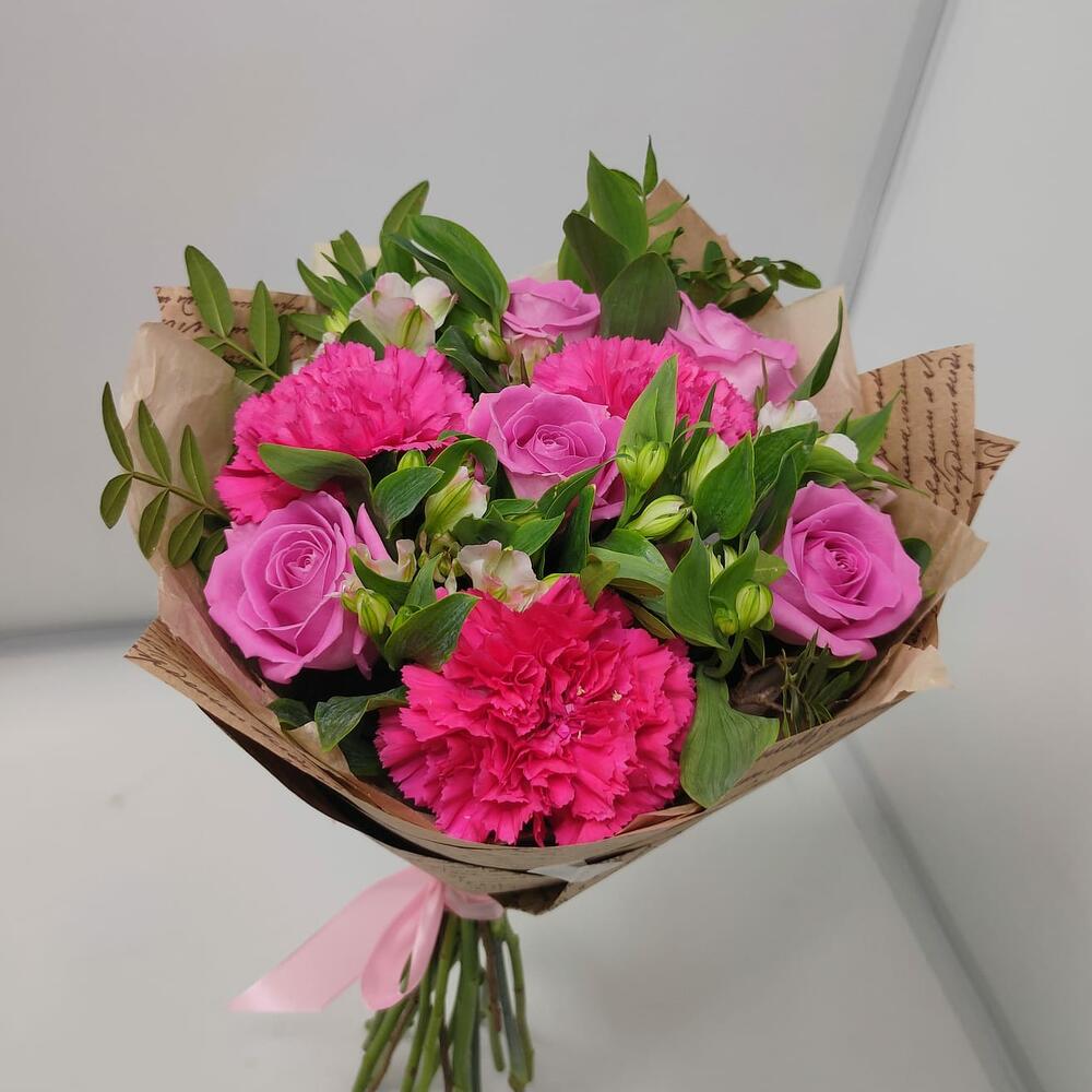 роза кения – 5 шт.Альстромерия – 5 шт.диантусы – 3 шт.зелень фисташки – 1 шт.Дизайнерская упаковка – 1 шт.