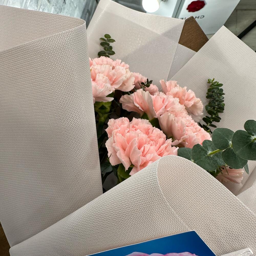 Эвкалипт – 1 шт.Лента атласная – 1 шт.Диантус сортовой – 13 шт.подкормка для срезанных цветов – 1 шт.инструкция по уходу за цветами – 1 шт.упаковка зефирка – 3 шт.