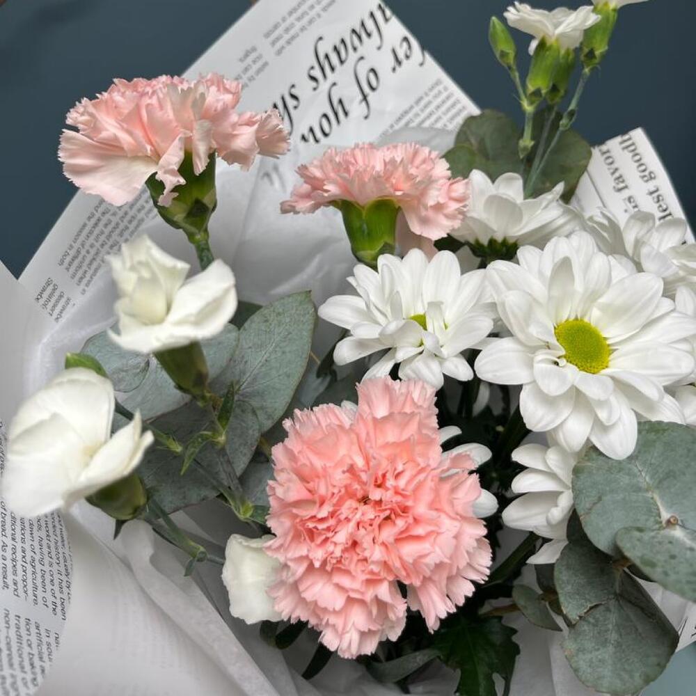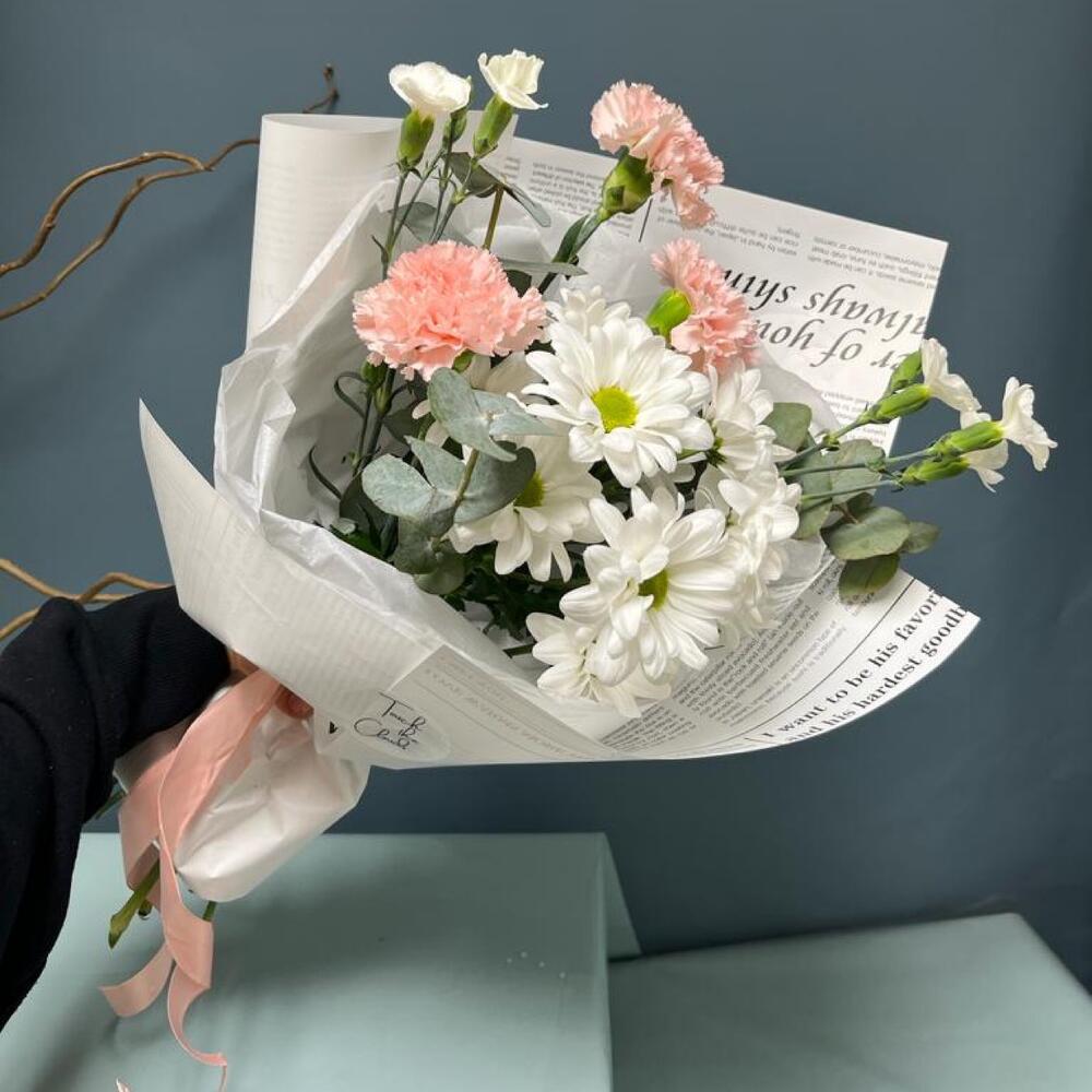 Эвкалипт – 3 шт.Кустовая хризантема – 1 шт.Гвоздика – 3 шт.Тишью – 1 шт.Кустовая гвоздика – 2 шт.Упаковка дизайнерская – 1 шт.