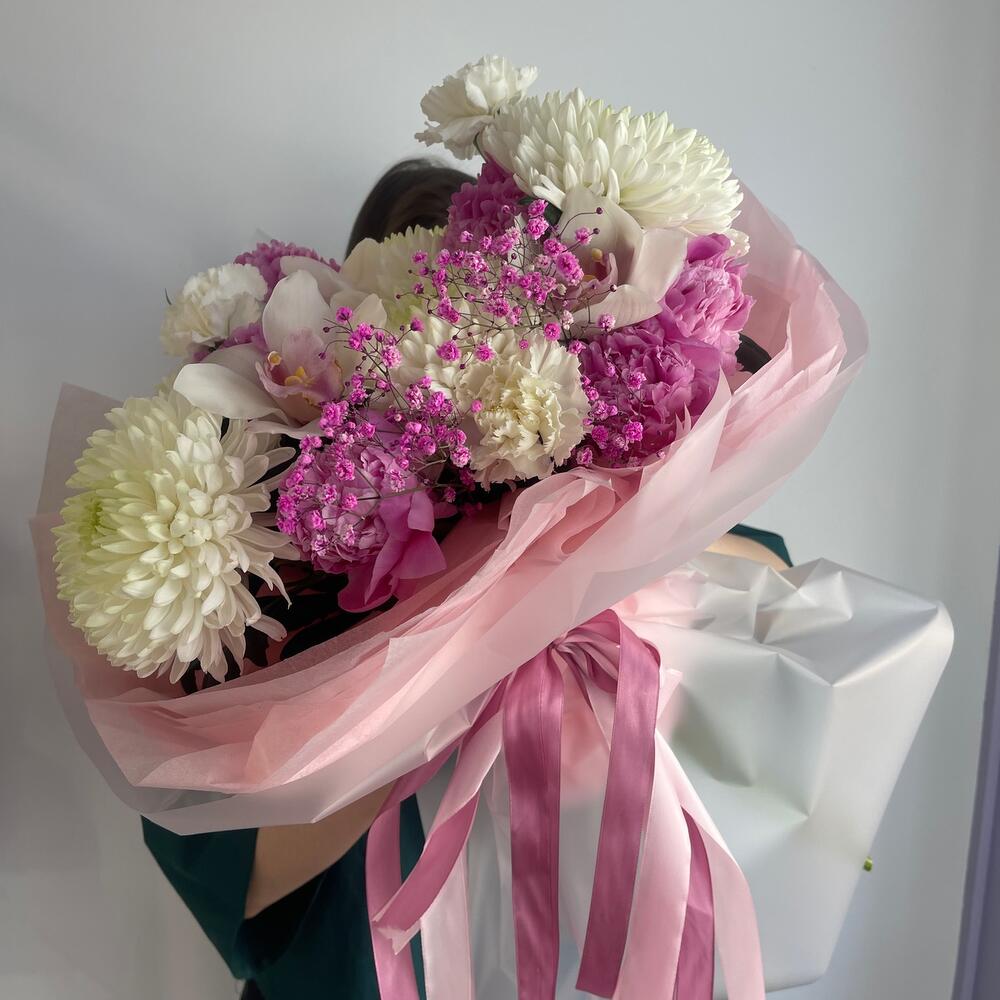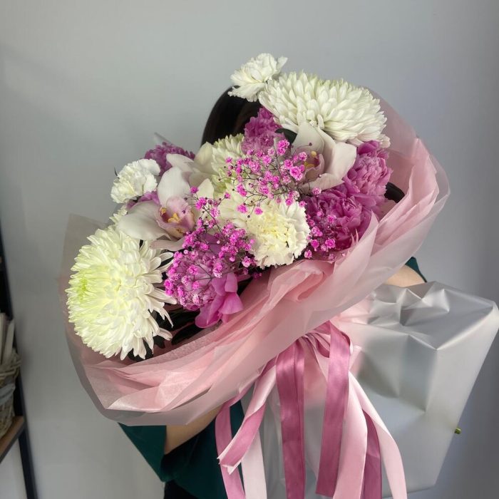 Гипсофила – 1 шт.Орхидея Цимбидиум – 3 шт.Пион – 6 шт.Хризантема – 5 шт.Тишью – 4 шт.Фисташка – 3 шт.Пленка матовая – 6 шт.Диантус сортовой – 3 шт.