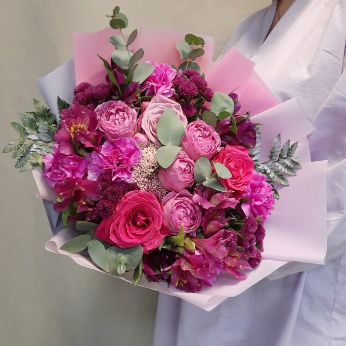 Роза кустовая пионовидная – 1 шт.Роза – 3 шт.Диантус – 4 шт.Сантини – 4 шт.Альстромерия Микс Европа – 4 шт.Озотамнус – 1 шт.Эвкалипт – 3 шт.Рускус – 12 шт.Упаковка дизайнерская – 2 шт.Лента атласная – 1 шт.