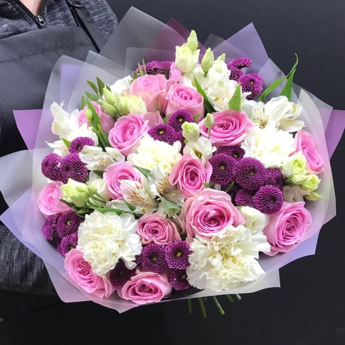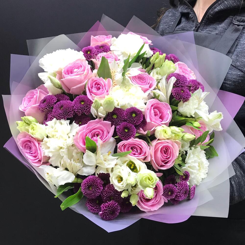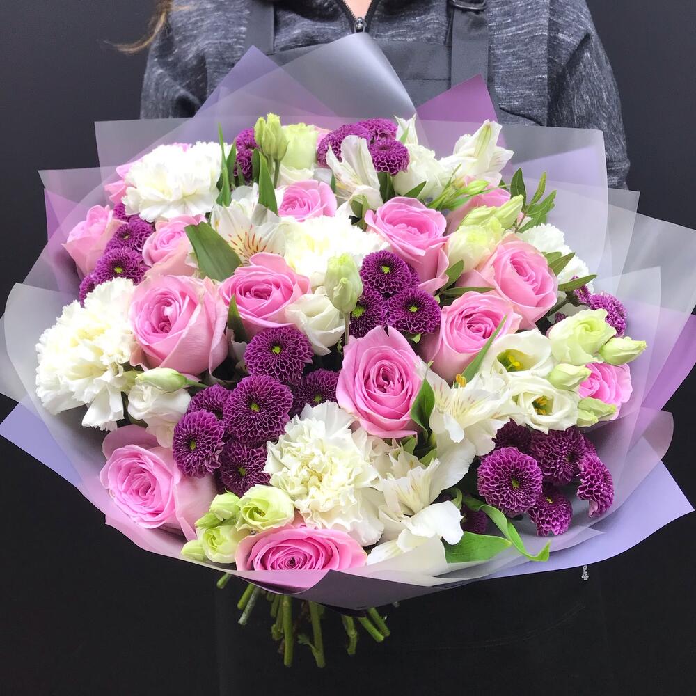 Альстромерии, Гвоздики, Кустовые розы, Лизиантусы, Розы, Хризантемы