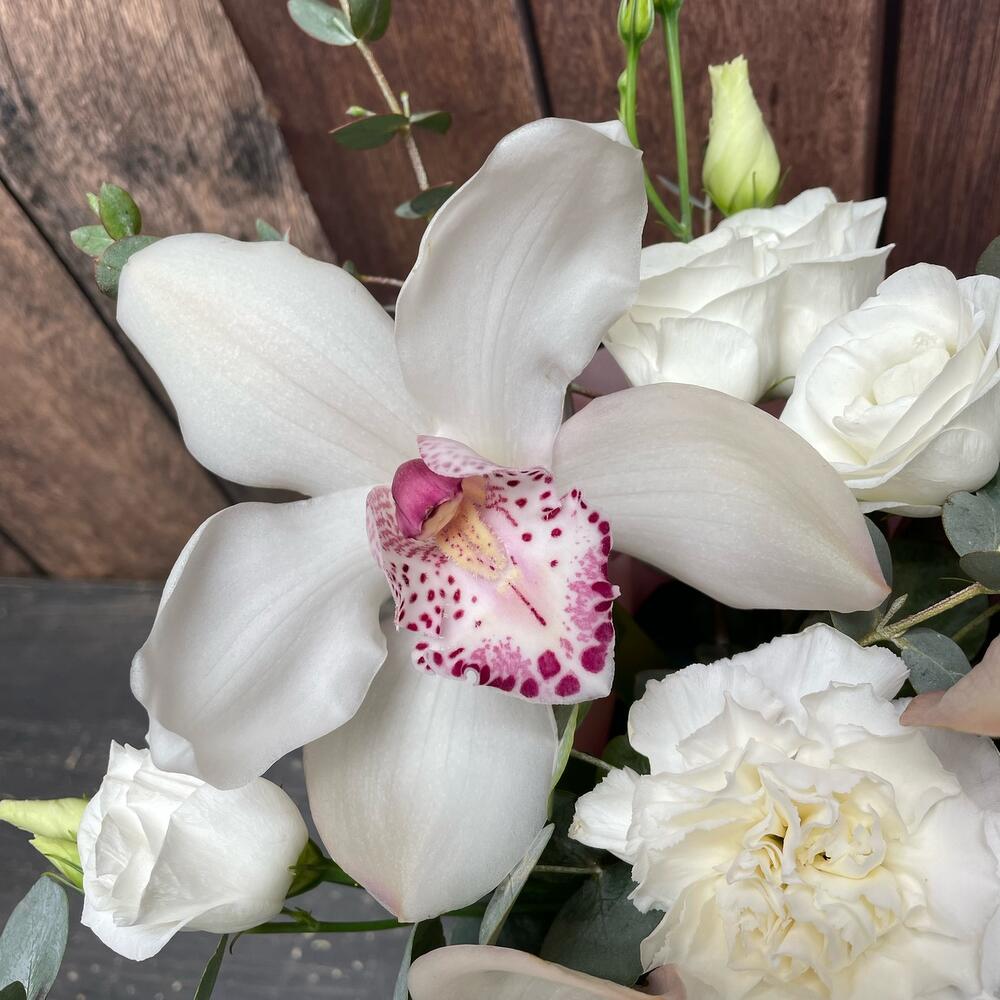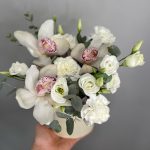 Орхидея Цимбидиум – 3 шт.Эустома – 2 шт.Диантус – 3 шт.Эвкалипт – 5 шт.Оазис флористический – 1 шт.Коробка – 1 шт.
