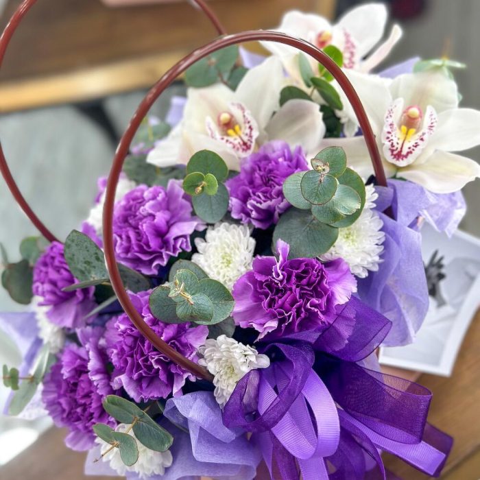 Орхидея Цимбидиум – 3 шт.Эвкалипт – 1 шт.Сантини – 3 шт.Открыточка с вашими пожеланиями – 1 шт.Оазис флористический – 1 шт.Средство для продления жизни цветов – 1 шт.Сумочка с ручками из плотного картона ламинированого – 1 шт.Диантус сортовой – 7 шт.инструкция по уходу за цветами – 1 шт.