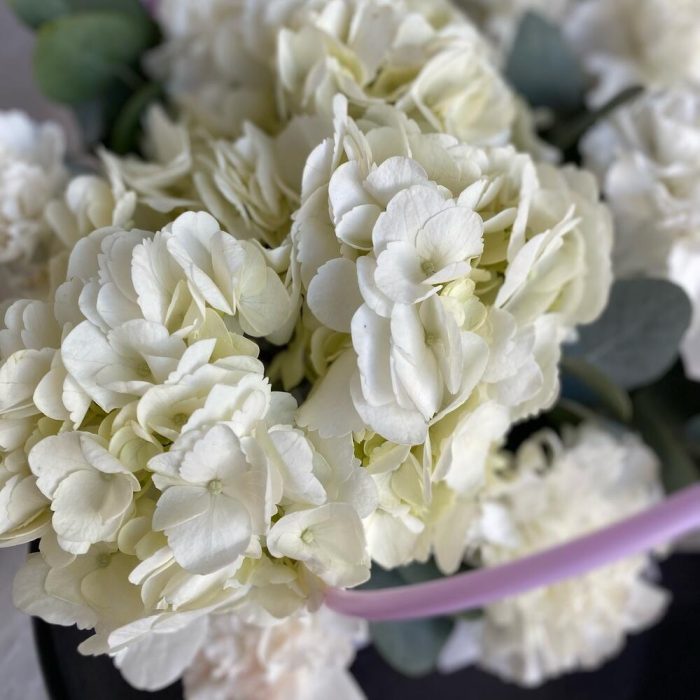 Гортензия – 1 шт.Эвкалипт – 5 шт.Сумка картон – 4 шт.Тишью – 1 шт.Диантус белый – 8 шт.Оазис флористический – 1 шт.