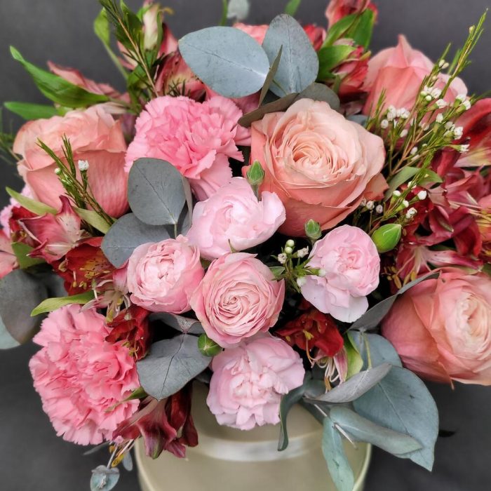 Роза Эквадор – 5 шт.Роза кустовая пионовидная – 2 шт.Диантус – 5 шт.Альстромерия – 3 шт.Диантус кустовой – 3 шт.зелень декоративная – 5 шт.Шляпная коробка – 1 шт.Оазис флористический – 1 шт.
