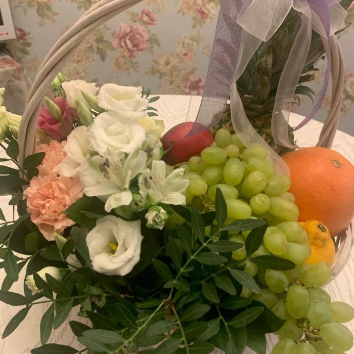 Фрезия – 3 гр.Зелень – 1 шт.Гвоздика – 3 шт.Виноград – 200 гр.Корзина плетеная – 1 шт.Упаковка дизайнерская – 1 шт.Грейпфрут – 1 шт.эустома белая – 1 шт.ананас декоративный – 1 шт.лимоны – 200 гр.мандарины – 500 гр.яблоки красные – 500 гр.