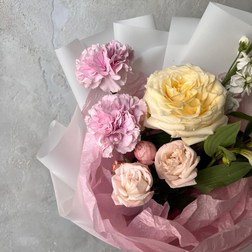 Роза – 2 шт.Диантус – 2 шт.Маттиола – 1 шт.Альстромерия – 1 шт.Упаковка дизайнерская – 1 шт.