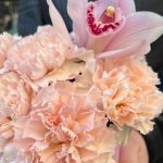 Орхидея Цимбидиум белая – 1 шт.Диантус кремовый – 7 шт.Оазис флористический – 1 шт.удлинитель для орхидеи – 1 шт.Лента атласная нежно-розовая – 1 шт.шляпная коробочка мини – 1 шт.
