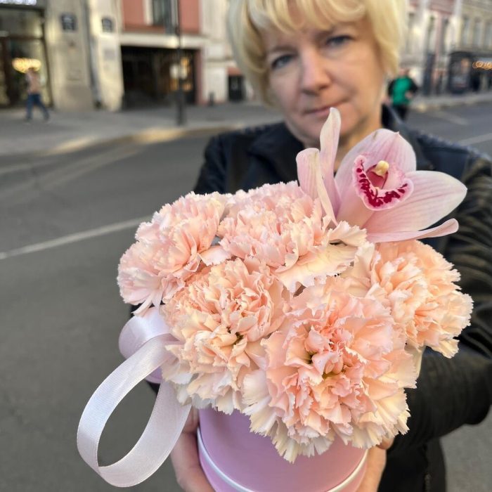 Орхидея Цимбидиум белая – 1 шт.Диантус кремовый – 7 шт.Оазис флористический – 1 шт.удлинитель для орхидеи – 1 шт.Лента атласная нежно-розовая – 1 шт.шляпная коробочка мини – 1 шт.