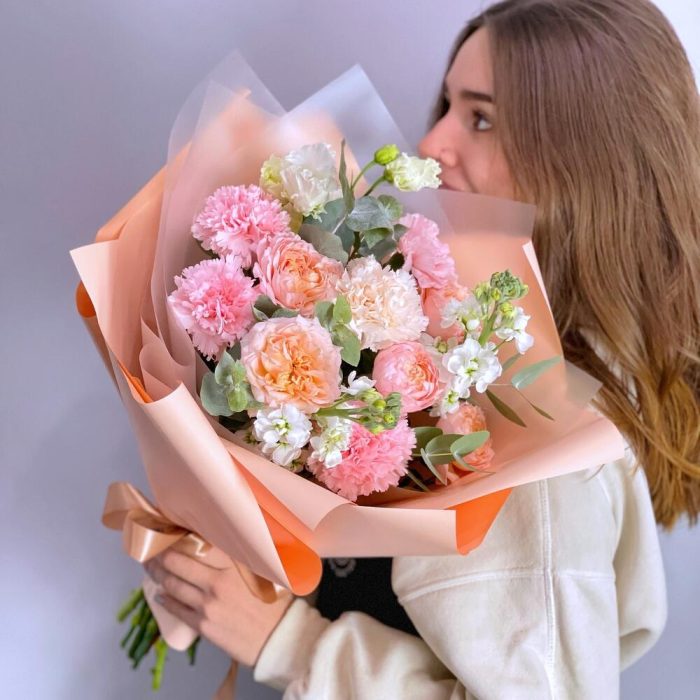 Нежный букет в персиковых тонах с кустовыми пионовидными розами сорта Джульетта, ароматной маттиолой и диантусами порадует любимую девушку, нежную маму, лучшую подругу.