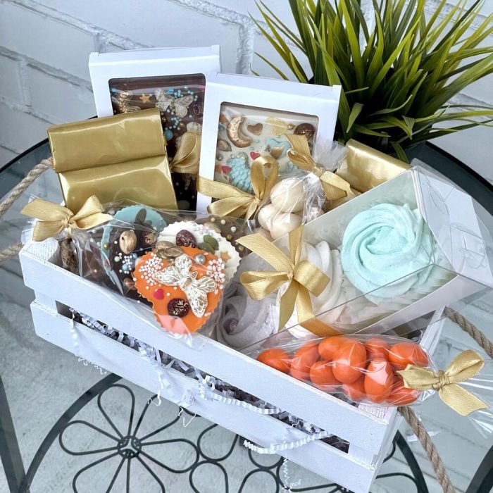 На День Рождения принято дарить что-то необычное и очень-очень вкусное!Корзинка с ароматным чаем, зефиром и шоколадом ручной работы – это то, что подарит эстетическое удовольствие и приведёт в восторг абсолютно любого, даже самого искушённого!В этот красивый набор мы положили: Две вкуснейшие бельгийские шоколадные плитки ручной работы. Из белого и молочного шоколада. С цельными орехами, сушёной клюквой, семечками и воздушным рисом, украшенные золотым пищевым кандурином. Нежнейший зефир ручной работы 3-х разных вкусов. Лавандовый, мятный и лимонный с ноткой ванили. Медианты ручной работы из белого, молочного, тёмного и апельсинового Бельгийского шоколада, также украшенные орешками, клюквой, семечками, воздушным рисом и золотым кандурином. Орешки- кешью в белом шоколаде и миндаль в глазури со вкусом манго. И конечно же ароматный черный и зелёный чай с фруктовыми добавками. Состав чёрного чая: Черный чай, плоды шиповника, сушёной яблоко, лемонграсс, лепестки василька, лепестки незабудки, ананас, цукаты. Состав зелёного чая: Чай зелёный байховый, плоды шиповника, лемонграсс, цедра цитрусовых, лепестки календулы, мята. Открытка авторская с Вашими пожеланиями. И частичка тепла в каждом наборе. Мы делали с любовью ❤️Подарите вкусные яркие эмоции себе и Вашим Любимым.