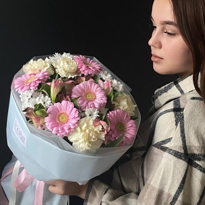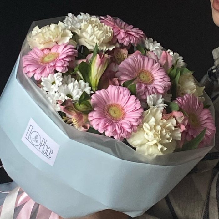 Гербера мини – 5 шт.Диантус – 4 шт.Хризантема мини – 4 шт.Альстромерия – 3 шт.Авторская упаковка – 1 шт.памятка по уходу и подкормка для цветов – 1 шт.крафт конверт – 1 шт.