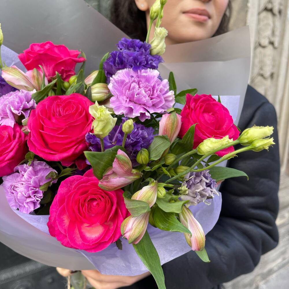 Альстромерия – 2 шт.Лизиантус – 2 шт.Гвоздика – 3 шт.Фисташка – 4 шт.Упаковка дизайнерская – 3 шт.Роза розовая 50 см – 5 шт.
