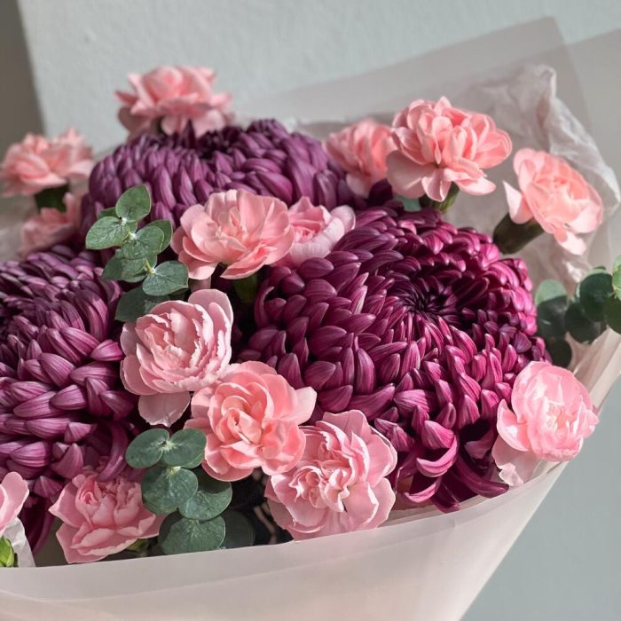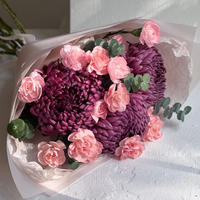 Альстромерии, Гвоздики, Кустовые розы, Лизиантусы, Розы, Хризантемы