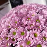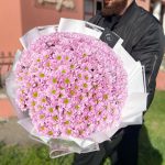 Букет из 41 ветки ромашковых хризантем в дизайнерском оформлении. Количество ромашек в букете может достигать 401 штуки