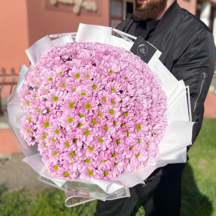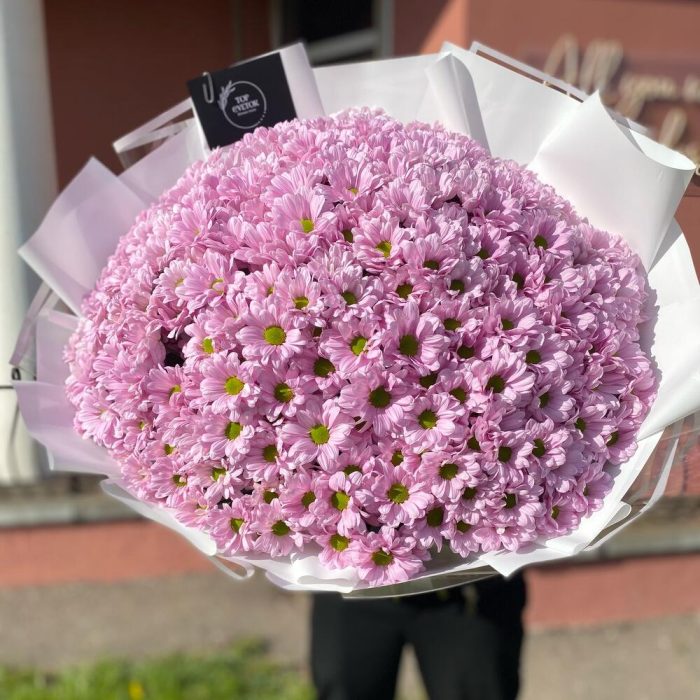 Букет из 41 ветки ромашковых хризантем в дизайнерском оформлении. Количество ромашек в букете может достигать 401 штуки
